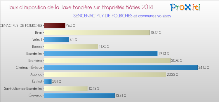 A noter : la valeur moyenne de ce taux de taxe foncière sur le bâti dans les communes françaises similaires à Sencenac-Puy-de-Fourches était de 13.44 %, en 2014.