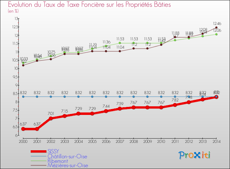 Pendant la même période, les communes françaises similaires à Sissy, ont vu leur taux de taxe foncière sur le bâti augmenter de 11.63 % en moyenne entre 2000 et 2014.