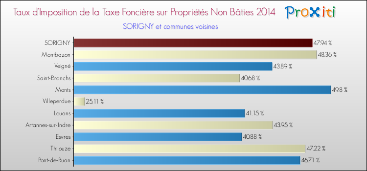 En 2014, le taux de la taxe foncière sur le non bâti vôté par le conseil municipal de Sorigny était de : 47.94 %.