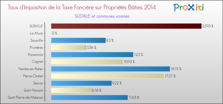 En 2014, le taux de la taxe foncière sur le bâti vôté par le conseil municipal de Susville était de : 22.95 %.