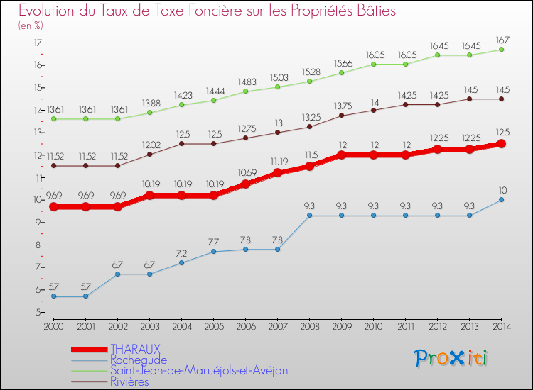 En 2014, le taux de la taxe foncière sur le bâti vôté par le conseil municipal de Tharaux était de : 12.5 %.