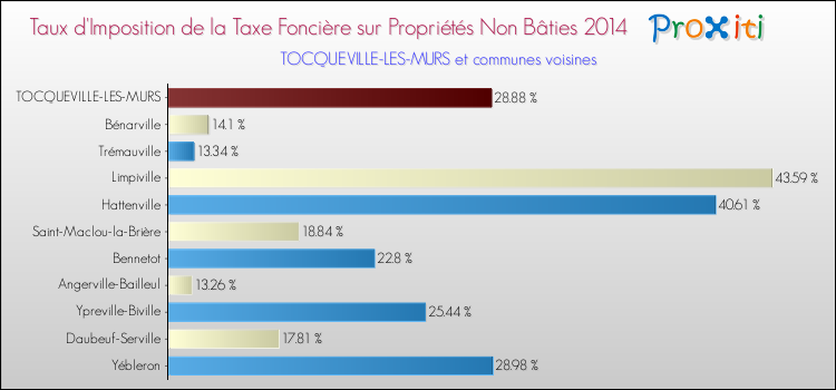 En 2014, le taux de la taxe foncière sur le non bâti vôté par le conseil municipal de Tocqueville-les-Murs était de : 28.88 %.
