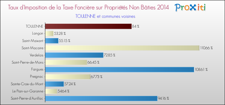 En 2014, le taux de la taxe foncière sur le non bâti vôté par le conseil municipal de Toulenne était de : 84 %.
