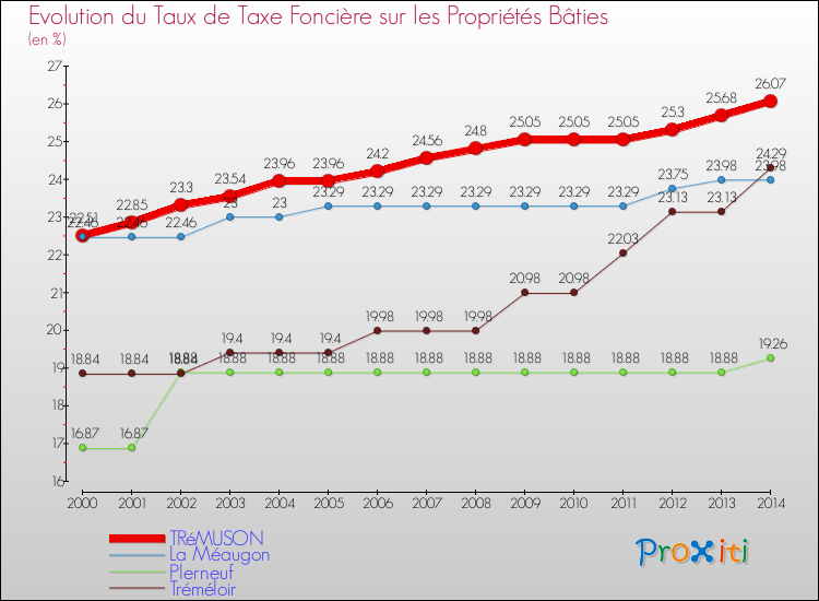 Pendant la même période, les communes françaises similaires à Trémuson, ont vu leur taux de taxe foncière sur le bâti augmenter de 14.84 % en moyenne entre 2000 et 2014.