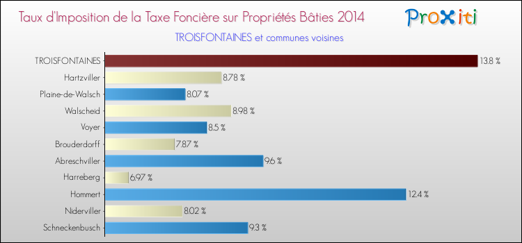En 2014, le taux de la taxe foncière sur le bâti vôté par le conseil municipal de Troisfontaines était de : 13.8 %.