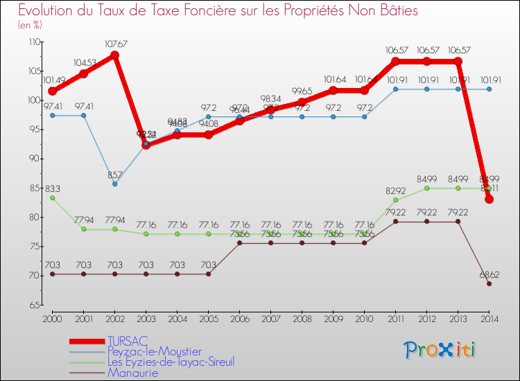 Pendant la même période, les communes françaises similaires à Tursac, ont vu leur taux de taxe foncière sur le non bâti baisser de 13.3 % en moyenne entre 2000 et 2014.