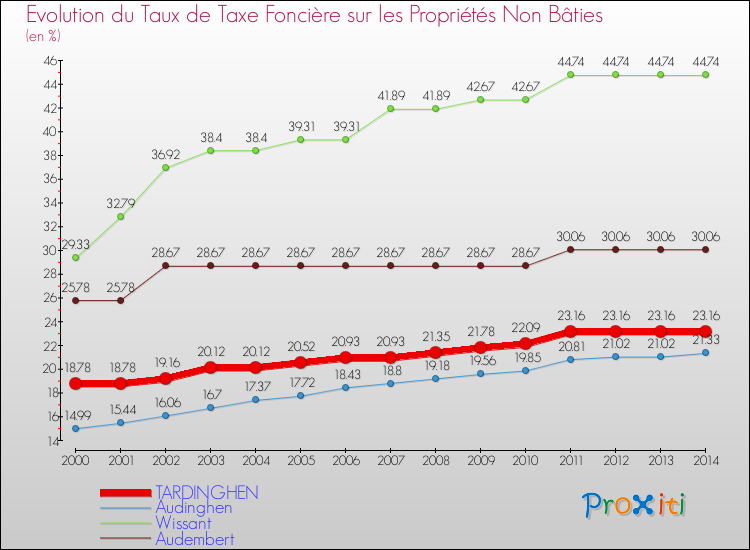 A Tardinghen, le taux de taxe foncière sur le non bâti a ainsi augmenté de 23.32 % entre 2000 et 2014.
