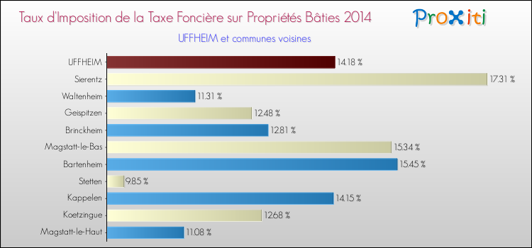 En 2014, le taux de la taxe foncière sur le bâti vôté par le conseil municipal de Uffheim était de : 14.18 %.