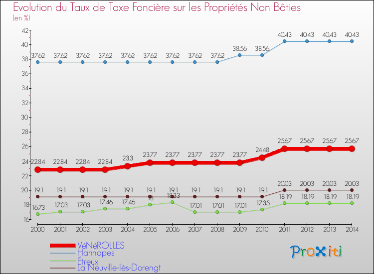En 2014, le taux de la taxe foncière sur le non bâti vôté par le conseil municipal de Vénérolles était de : 25.67 %.