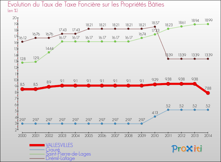 Pendant la même période, les communes françaises similaires à Vallesvilles, ont vu leur taux de taxe foncière sur le bâti augmenter de 10.76 % en moyenne entre 2000 et 2014.