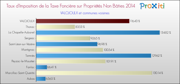 En 2014, le taux de la taxe foncière sur le non bâti vôté par le conseil municipal de Valojoulx était de : 116.43 %.
