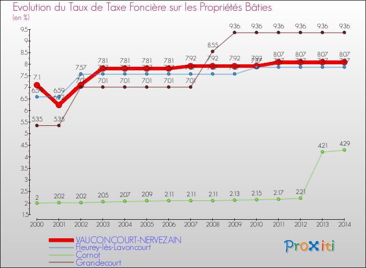 Pendant la même période, les communes françaises similaires à Vauconcourt-Nervezain, ont vu leur taux de taxe foncière sur le bâti augmenter de 21.52 % en moyenne entre 2000 et 2014.