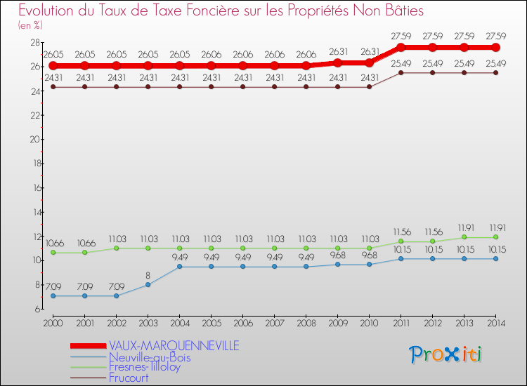 A Vaux-Marquenneville, le taux de taxe foncière sur le non bâti a ainsi augmenté de 5.91 % entre 2000 et 2014.