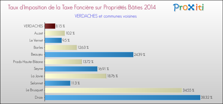 En 2014, le taux de la taxe foncière sur le bâti vôté par le conseil municipal de Verdaches était de : 8.15 %.