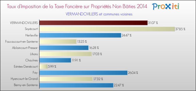 En 2014, le taux de la taxe foncière sur le non bâti vôté par le conseil municipal de Vermandovillers était de : 31.07 %.