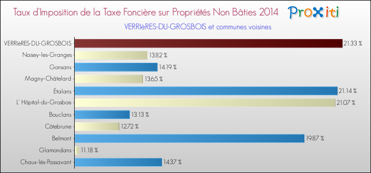 En 2014, le taux de la taxe foncière sur le non bâti vôté par le conseil municipal de Verrières-du-Grosbois était de : 21.33 %.