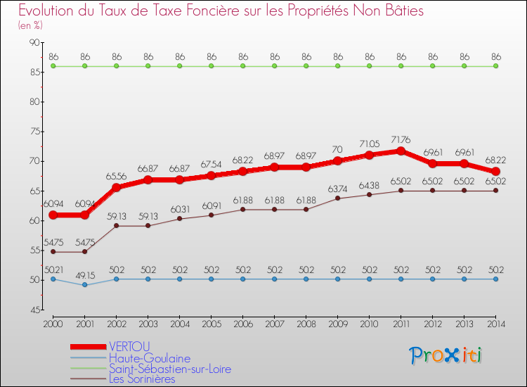 Pendant la même période, les communes françaises similaires à Vertou, ont vu leur taux de taxe foncière sur le non bâti augmenter de 14.27 % en moyenne entre 2000 et 2014.
