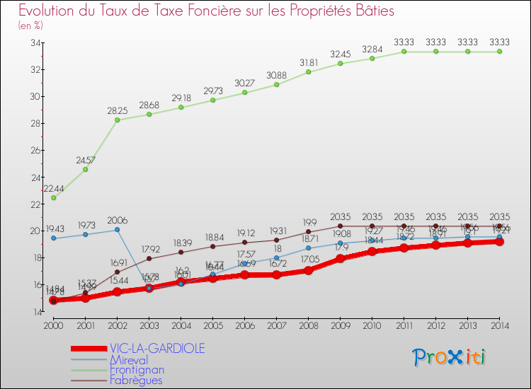 A Vic-la-Gardiole, le taux de taxe foncière sur le bâti a donc augmenté de 29.45 % entre 2000 et 2014.