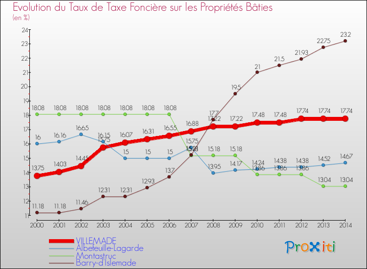 A Villemade, le taux de taxe foncière sur le bâti a donc augmenté de 29.02 % entre 2000 et 2014.