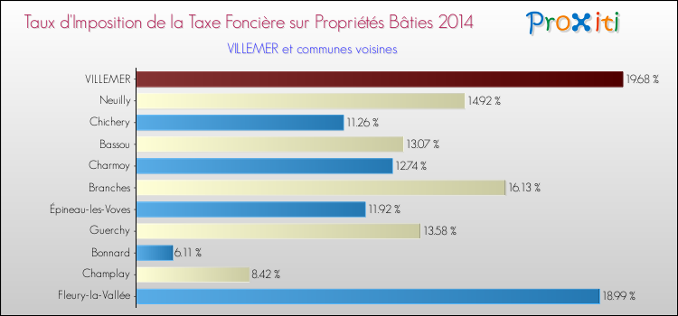 En 2014, le taux de la taxe foncière sur le bâti vôté par le conseil municipal de Villemer était de : 19.68 %.