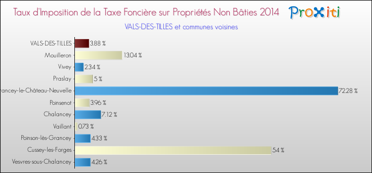 En 2014, le taux de la taxe foncière sur le non bâti vôté par le conseil municipal de Vals-des-Tilles était de : 3.88 %.