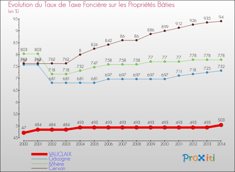 A Vauclaix, le taux de taxe foncière sur le bâti a donc augmenté de 7.02 % entre 2000 et 2014.