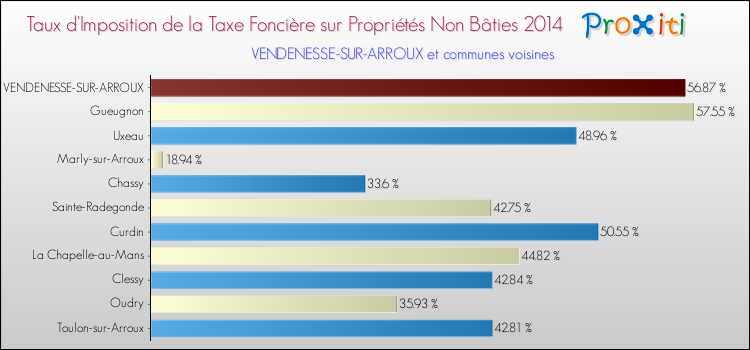 En 2014, le taux de la taxe foncière sur le non bâti vôté par le conseil municipal de Vendenesse-sur-Arroux était de : 56.87 %.