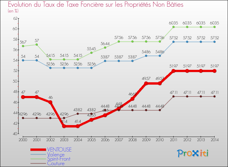 A Ventouse, le taux de taxe foncière sur le non bâti a ainsi augmenté de 10.57 % entre 2000 et 2014.