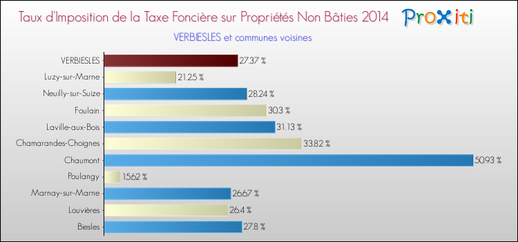 En 2014, le taux de la taxe foncière sur le non bâti vôté par le conseil municipal de Verbiesles était de : 27.37 %.