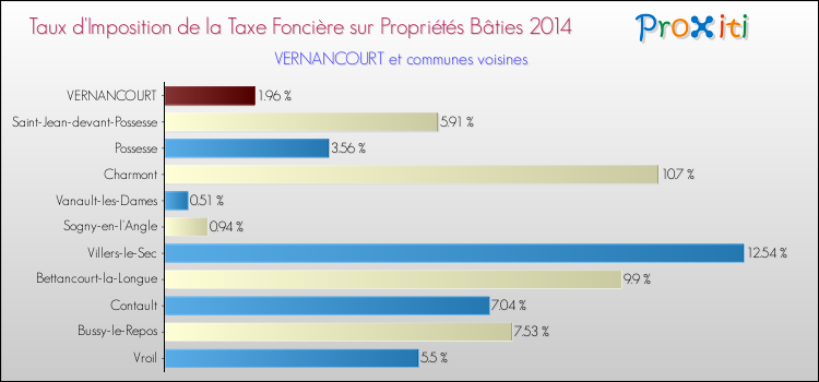 En 2014, le taux de la taxe foncière sur le bâti vôté par le conseil municipal de Vernancourt était de : 1.96 %.