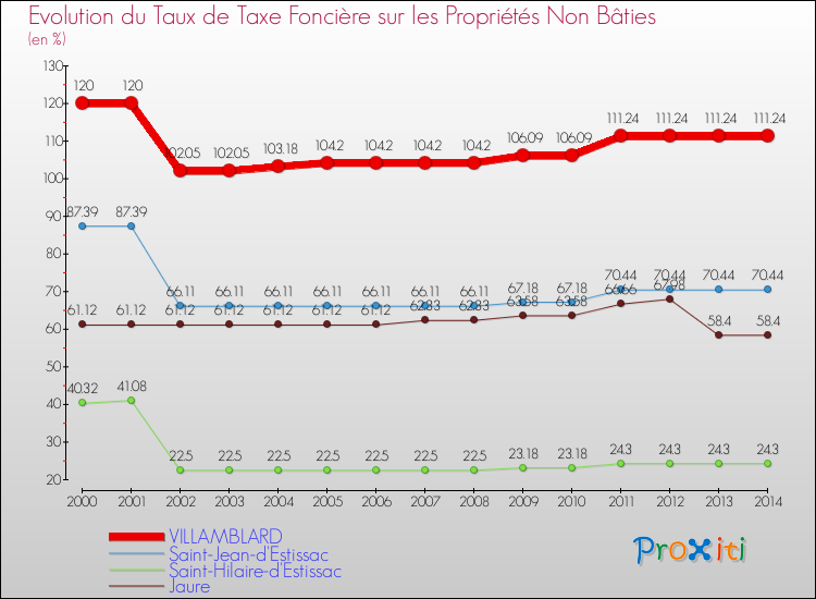 A Villamblard, le taux de taxe foncière sur le non bâti a ainsi baissé de 7.3 % entre 2000 et 2014.