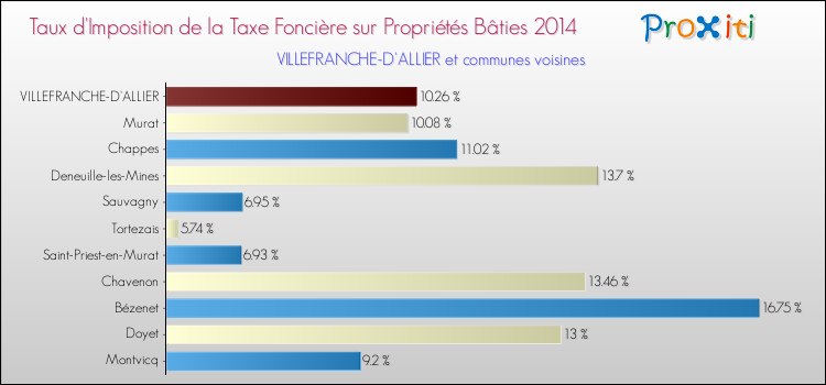 En 2014, le taux de la taxe foncière sur le bâti vôté par le conseil municipal de Villefranche-d'Allier était de : 10.26 %.