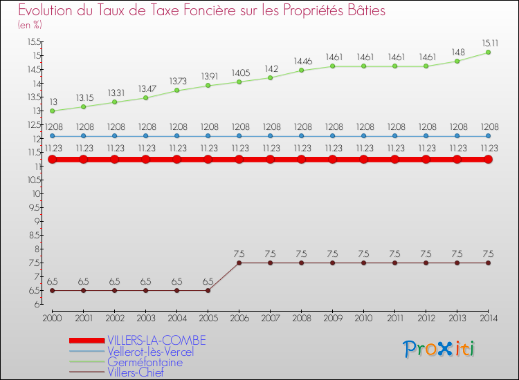 En 2014, le taux de la taxe foncière sur le bâti vôté par le conseil municipal de Villers-la-Combe était de : 11.23 %.