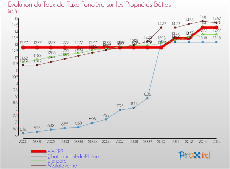A Viviers, le taux de taxe foncière sur le bâti a donc augmenté de 11.98 % entre 2000 et 2014.
