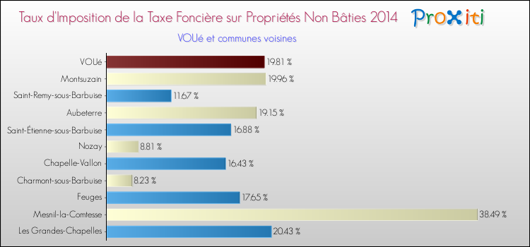Vous trouverez ci-dessous des graphiques qui vous permettent de situer le taux de la taxe foncière sur le non bâti de Voué par rapport aux communes voisines.