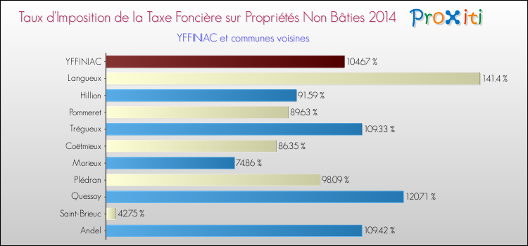 En 2014, le taux de la taxe foncière sur le non bâti vôté par le conseil municipal de Yffiniac était de : 104.67 %.