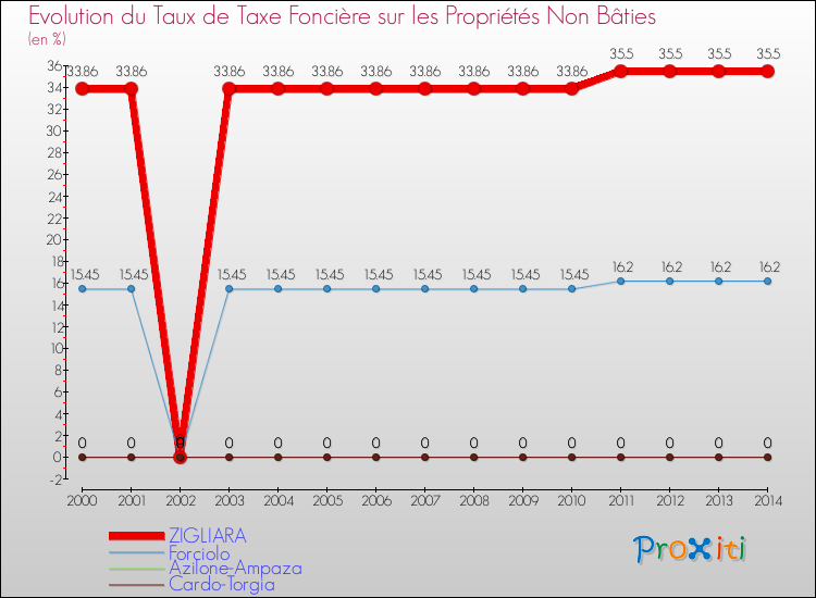 A Zigliara, le taux de taxe foncière sur le non bâti a ainsi augmenté de 4.84 % entre 2000 et 2014.