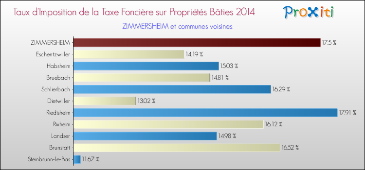 En 2014, le taux de la taxe foncière sur le bâti vôté par le conseil municipal de Zimmersheim était de : 17.5 %.