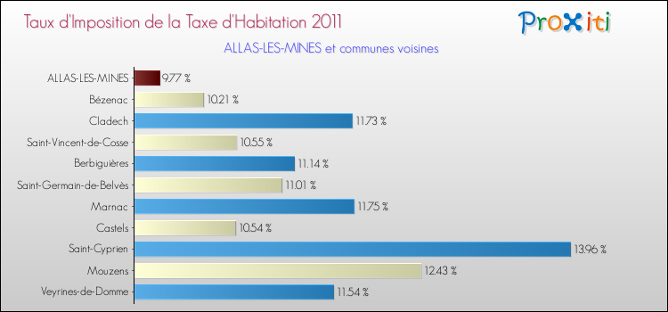 En 2011, le taux de la taxe d'habitation vôté par le conseil municipal de Allas-les-Mines était de : 9.77 %.