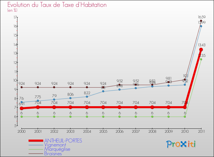 Le graphique ci dessous représente l'évolution du taux de la taxe d'habitation à Antheuil-Portes depuis 2000.