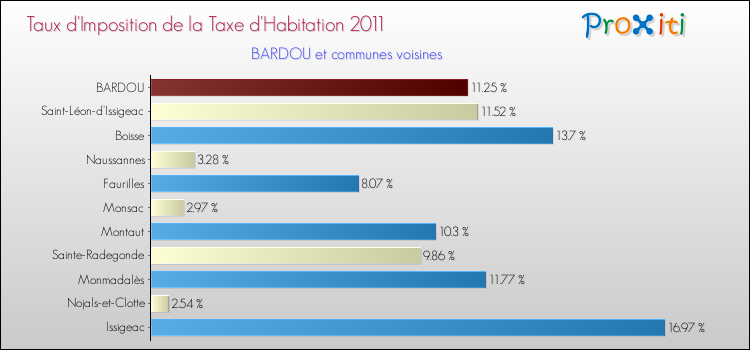 Vous trouverez ci-dessous des graphiques qui vous permettent de situer le taux de la taxe d'habitation de Bardou par rapport aux communes voisines.