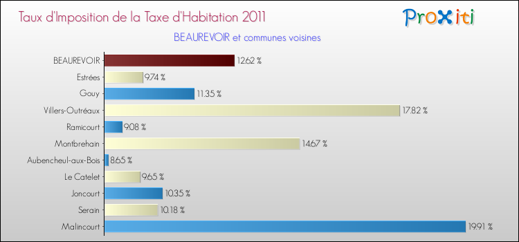 En 2011, le taux de la taxe d'habitation vôté par le conseil municipal de Beaurevoir était de : 12.62 %.