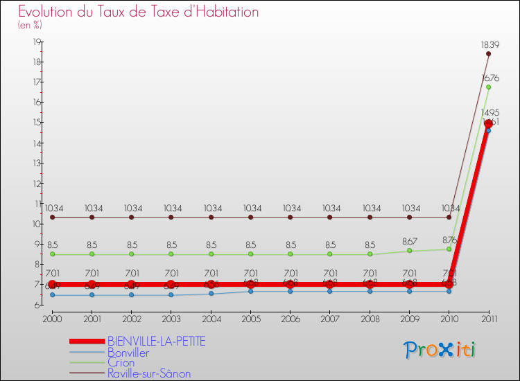 Pendant la même période, les communes françaises similaires à Bienville-la-Petite, ont vu leur taux de taxe d'imposition augmenter de 4.32 % en moyenne entre 2000 et 2010.