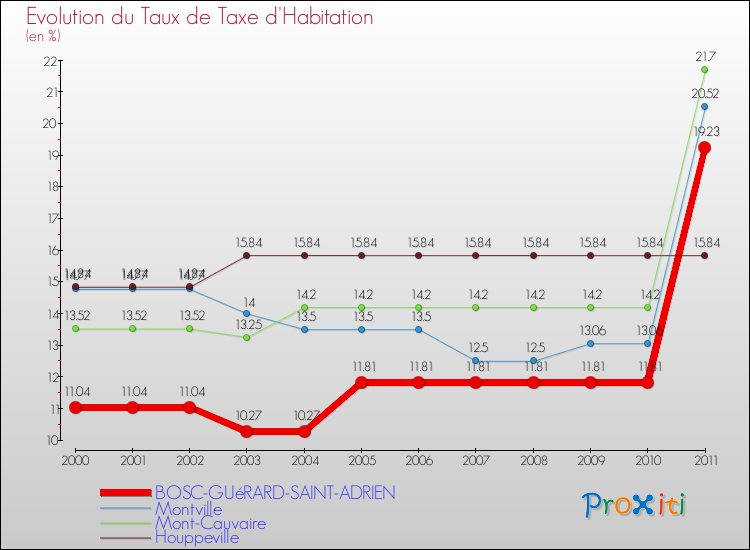 Le graphique ci dessous représente l'évolution du taux de la taxe d'habitation à Bosc-Guérard-Saint-Adrien depuis 2000.