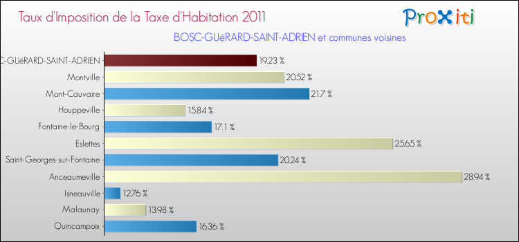 Vous trouverez ci-dessous des graphiques qui vous permettent de situer le taux de la taxe d'habitation de Bosc-Guérard-Saint-Adrien par rapport aux communes voisines.