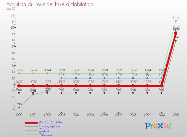 En 2011, le taux de la taxe d'habitation vôté par le conseil municipal de Belgodère était de : 19.09 %.