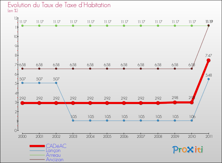 Etant donné cette hausse qui fausse quelque peu la donne, nous présentons ci dessous l'évolution du taux de taxe d'habitation sur la période 2000-2010, et non 2000-2011 :