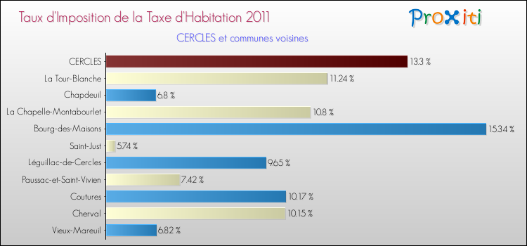 Vous trouverez ci-dessous des graphiques qui vous permettent de situer le taux de la taxe d'habitation de Cercles par rapport aux communes voisines.
