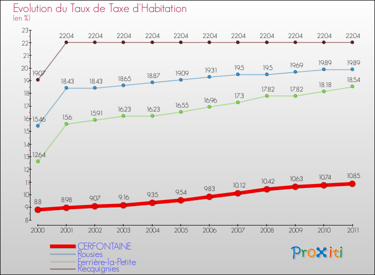 Pendant la même période, les communes françaises similaires à Cerfontaine, ont vu leur taux de taxe d'imposition augmenter de 24.18 % en moyenne entre 2000 et 2011.