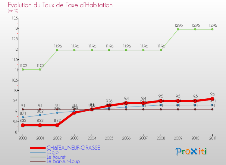 En 2011, le taux de la taxe d'habitation vôté par le conseil municipal de Châteauneuf-Grasse était de : 9.6 %.